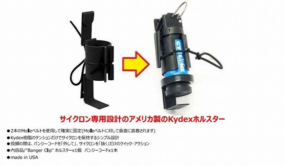 CQBフィールドなどで圧倒的な効果を発揮するトルネードグレネードにニューモデルが登場。 ★QUANTUM・DRIVE/クァンタム・ドライブ・エンジン搭載 ●従来の「トルネード・グレネード」はガスの圧力だけで、強制的に後ろから押し出すようにBB弾を放出する構造だったのに対して、「サイクロン」のエンジンは、コンパクトボディに収められたバレルユニットにBB弾を通過せながらひとつひとつに回転をかけることで、ガスのエネルギーを無駄なくムラなくBB弾に伝達し、より強く安定した速度で最後の一発までBB弾を射出します ●無駄のない射出システムにより、低燃費を実現(ガスの消費量/充填量を従来のトルネード・グレネードより30%以上カット) ★Ez リロード & シンプル構造 ●BB弾の再装填は、本体底部のエンド・キャップを外して流し込むだけ!従来のトルネードのようにBBローダー等を使う面倒な再装填作業はナシ ●トリガーシステムを起爆位置へ戻す動作は、1秒足らず!「トリガーユニット」「スプーン」「ピン」だけのシンプル構造で、パーツ紛失の心配もありません ●すべての再装填動作にかかる時間は、30-40秒。再装填作業に器具や道具は不要 サイズ:高さ10.9mm × 直径4.0mm ※直径はバンパー部分を含まず。 重量:117g 装弾数:140発(6mmBB弾使用) 起爆タイプ:インパクト型 初速:68.6m/s 初速変動幅:0.06m/s ガス消費量:トルネードの2/3 【内容品】 サイクロン本体、専用スプーンレバー、スプーンピン、専用オイル、ジャケットステッカー、図解入り日本語説明書 ※ジャケットステッカーは、ブルー、オレンジ、ブラック3種類がセット(ブルーがデフォルトで本体に貼られています)